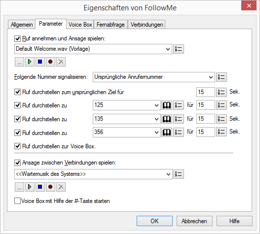 Für diesen Block sind unter „Eigenschaften“ die Registerkarten „Allgemein“, „Parameter“, „Voice Box“, „Fernabfrage“ und „Verbindungen“ verfügbar.