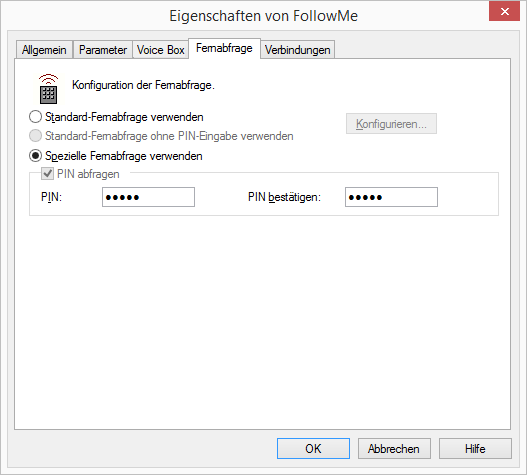 | Konfigurieren Sie die Standard-Fernabfrage innerhalb einer Umleitung bzw. Systemregel, so wird die Benutzer-PIN immer abgefragt, ein Kontrollkästchen hierfür existiert nicht. Rufen Sie von Ihrer eigenen Durchwahl aus an, für die diese Umleitung konfiguriert wurde, so wird die Benutzer-PIN nicht abgefragt. |