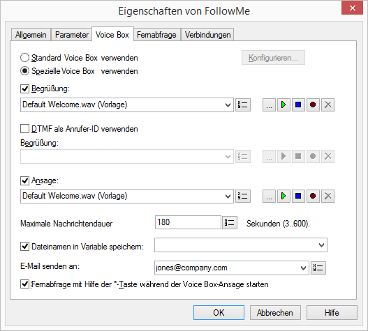 9 Legen Sie fest, ob Sie Ihre normale Standard Voice Box verwenden oder ob Sie für diese Aktion eine spezielle Voice Box (z. B. mit einer anderen Ansage) definieren möchten.