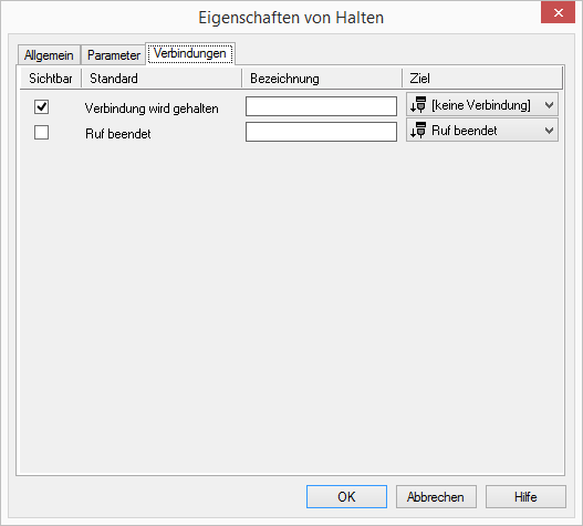 | Legt der Anrufer auf, während der Anruf gehalten wird, so wird dies erst in dem Block festgestellt, der den Anruf wieder aktivieren möchte. Dieser Block wird dann durch den Ausgang „Anruf beendet“ verlassen. |