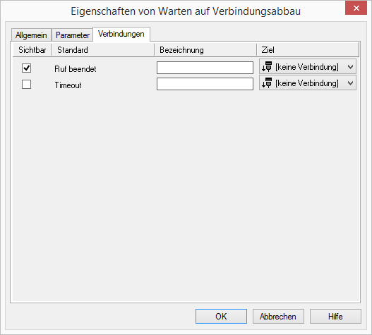 | In der Spalte „Sichtbar“ legen Sie lediglich die Sichtbarkeit der Verbindungen im Skript-Fenster fest. Diese Einstellung dient nur der Übersichtlichkeit eines Skriptes. Entfernen können Sie die Ausgänge nicht, d. h. die Verbindungen müssen trotzdem bestehen, da sonst ein Fehler im Skript auftritt. |