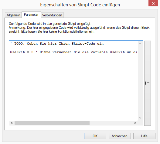 Mit Hilfe dieses Blocks können Sie ein eigenes Visual Basic Script einfügen. Dieser Programm-Teil wird ausgeführt, wenn dieser Block erreicht wird.