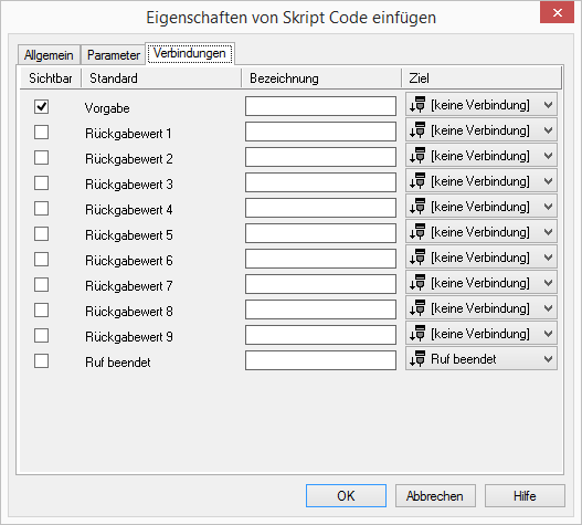 | In der Spalte „Sichtbar“ legen Sie lediglich die Sichtbarkeit der Verbindungen im Skript-Fenster fest. Diese Einstellung dient nur der Übersichtlichkeit eines Skriptes. Entfernen können Sie die Ausgänge nicht, d. h. die Verbindungen müssen trotzdem bestehen, da sonst ein Fehler im Skript auftritt. |