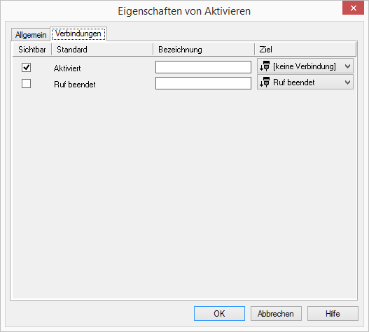 | In der Spalte „Sichtbar“ legen Sie lediglich die Sichtbarkeit der Verbindungen im Skript-Fenster fest. Diese Einstellung dient nur der Übersichtlichkeit eines Skriptes. Entfernen können Sie die Ausgänge nicht, d. h. die Verbindungen müssen trotzdem bestehen, da sonst ein Fehler im Skript auftritt. |