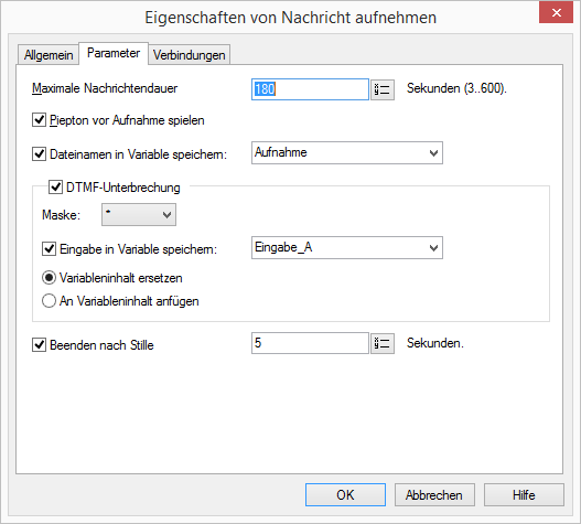Mit dem Block „Nachricht aufnehmen“ wird eine Nachricht des Anrufers aufgenommen. Vor Beginn der Aufnahme kann wahlweise ein Piepton gespielt werden. Die Aufnahmezeit kann zeitlich begrenzt werden (Timeout), damit die resultierende Datei nicht zu groß wird. Die Aufzeichnung einer Nachricht kann auch bei eintretender Stille beendet werden. Die Dauer dieser Stille kann festgelegt werden.