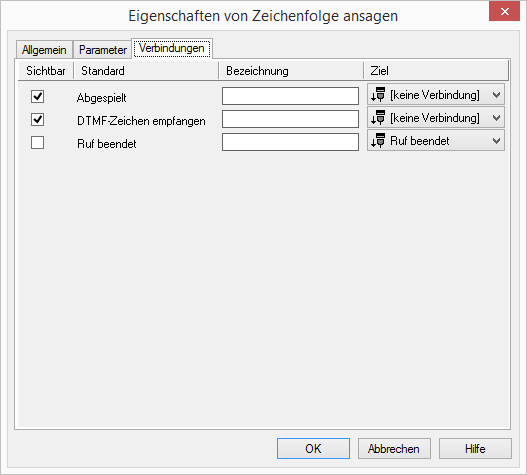 | Bei der auszugebenden Zeichenfolge, werden hier nur DTMF-Zeichen (0-9,*,#) angesagt. Beinhaltet die Zeichenfolge Buchstaben oder andere Zeichen, werden diese bei der Ausgabe übersprungen. |