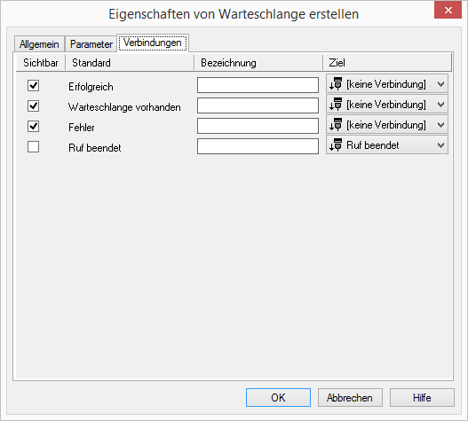 Dieser Block erzeugt eine neue Warteschlange. Eine Warteschlange enthält alle eingehenden Anrufe in einer bestimmten Reihenfolge. Allen Anrufern wird eine Wartemusik vorgespielt und sie erhalten, sofern konfiguriert, Auskunft über die momentane Position ihres Anrufes in der Warteschlange und werden über die voraussichtliche Wartezeit informiert.