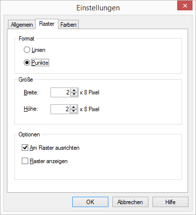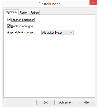 Sie können hier die Ansicht des Skript-Fensters, wie z.B. die Erscheinungsform der Blöcke und der Verbindungen, sowie die des Rasters verändern.