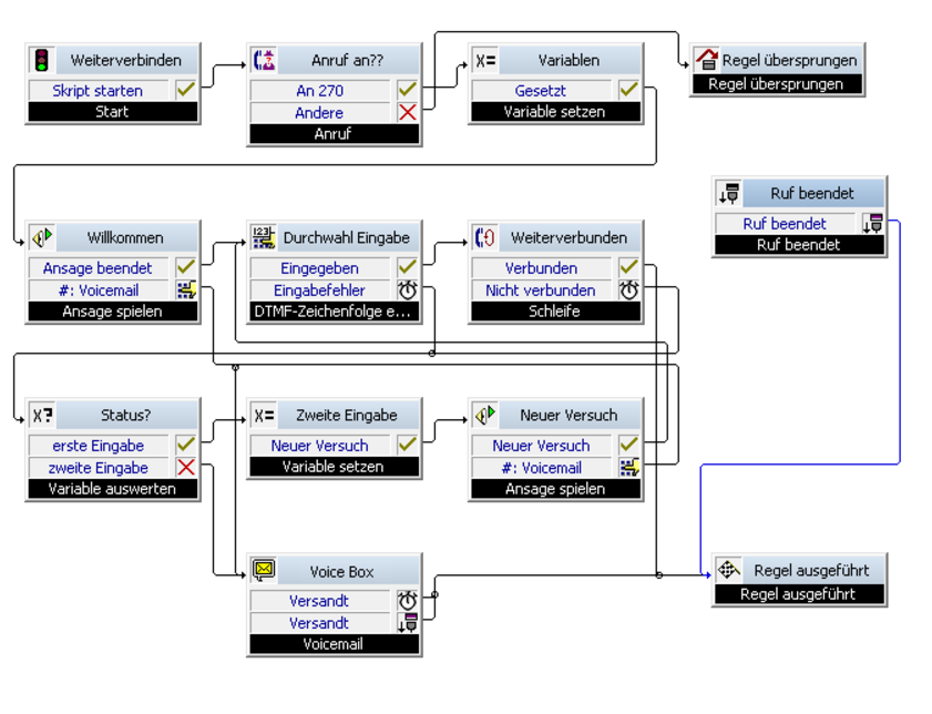 Es werden die später zu verwendenden Variablen „Eingabe“ und „Eingabestatus“ gesetzt. Anschließend wird eine Willkommen-Ansage gespielt und zur Eingabe einer dreistelligen Nummer (via DTMF) aufgefordert. Zu dieser Nummer wird weiterverbunden. Gelingt die Weiterleitung, ist das Skript beendet und keine weitere Regel wird ausgeführt.