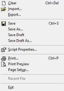Script Properties... | Opens the window containing the general script properties Here you can change the script name, author, description and the block appearance. |
