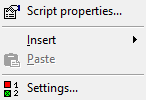 Script Properties... | Opens the window containing the general script properties Here you can change the script name, author, description and the block appearance. |