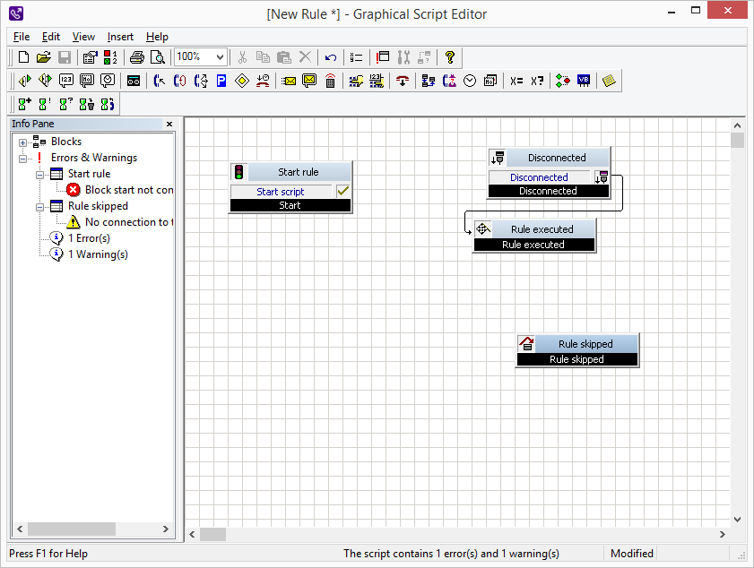 the Graphical Script Editor appears. On the right side of the window, you will see the default blocks for the rule: "Start rule", "Rule executed", "Rule skipped" and "Disconnected".