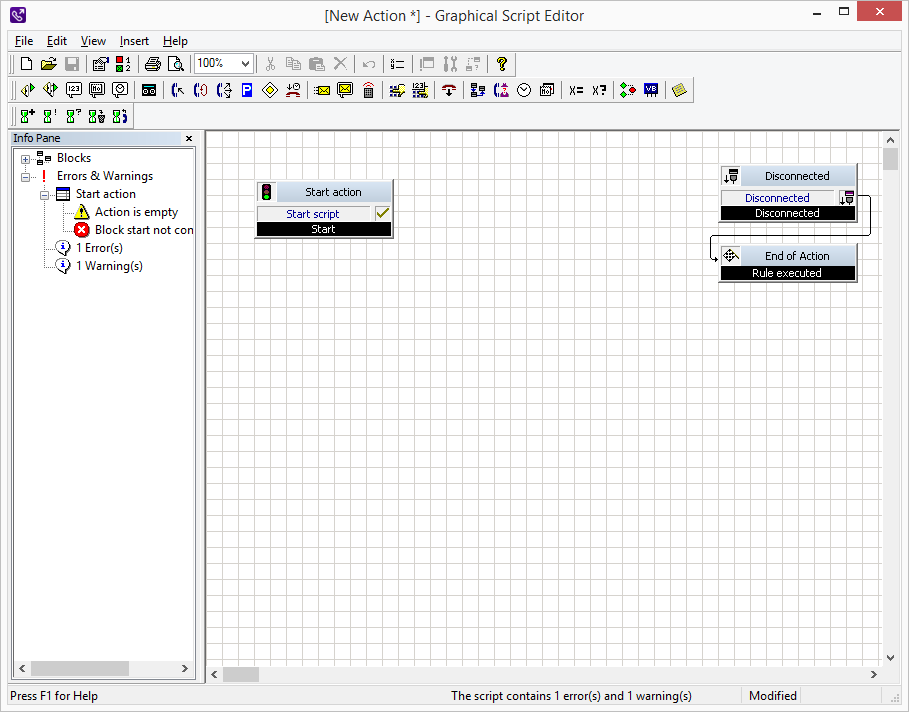 You can now position the blocks you want on the grid interface in the script window and enter the appropriate parameters. The contacts of all blocks (the input as well as the outputs) must be connected. In the Info pane you will see the messages concerning the errors and warnings. These messaged provide information concerning any missing connections or parameters.