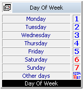 To design an error-free script, a path must be defined for every day, otherwise you will receive the message "Not all days handled" in the Info pane. If the display of another connected output is deactivated on the tab, you will receive warning concerning this e.g. "Day of week output ‘Sunday’ not connected" in the Info pane. Not all eight outputs can be occupied. If all days of the week are connected and also the output "Other days", the warning "Output ‘Other days’ not available" will appear.