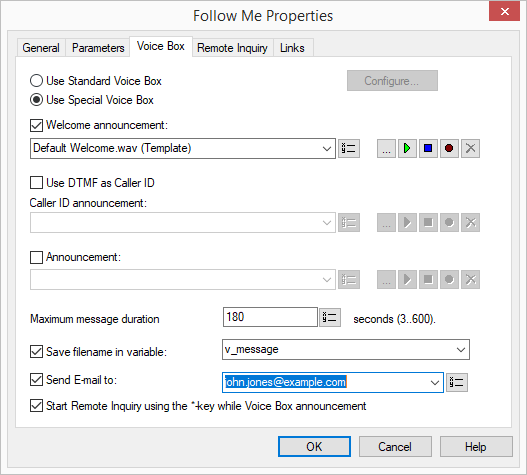 14 If you would like to save the name of the recorded message, activate "Save filename in variable:" and define the variable, in which the file name should be saved.