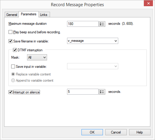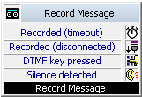 The block "Record Message" is used to record a caller’s message. It is possible to have a beep played before recording begins. The recording time can be limited (Timeout) so that the resulting file does not become too large. The recording of a message can also be terminated when silence occurs. The duration of silence can be defined.