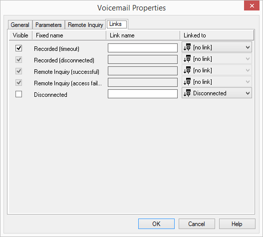 The second column "Default" contains the default name of the output. This provides information about events during the execution of a block so that additional appropriate connections can be created. This fixed name cannot be changed. You can assign your own identifying names to the various contact surfaces in the column "Link name". This name will later appear in the block in the grid interface.