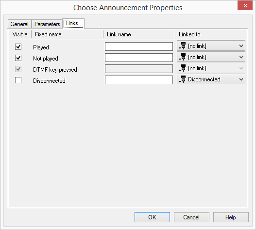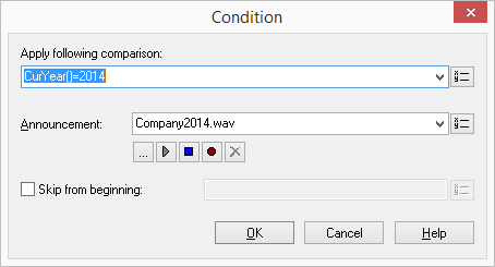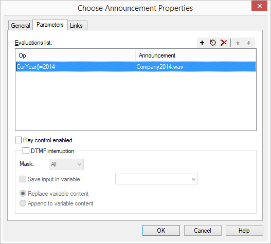 Here you can evaluate variables several times and depending on the result of the individual logical statement, you can have a different announcement played. You define which variable should be evaluated on the "Parameters" tab. Then you can define several different logical comparisons. The evaluation list will be completely sequentially processed from the top to the bottom. All announcements, whose corresponding statement has the value "True", will be played. All further announcements will be skipped.
