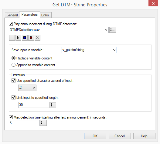 Here you can prompt the caller to enter a string via DTMF and then store the values detected in a variable. Using the parameters, you can define the key used to end the entry and the maximum length of the string. In addition, you can define the maximum period of time to be waited for the detection of other keys (timeout).