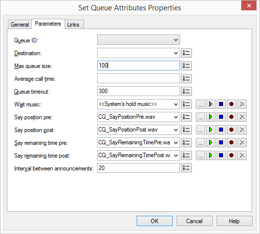 The block "Set Queue Attributes" can be used to set or change the different attributes of the queue. The block can be used, for example, to define the music on hold that every caller hears, to define the maximum queue size (number of calls) and to configure additional announcements.