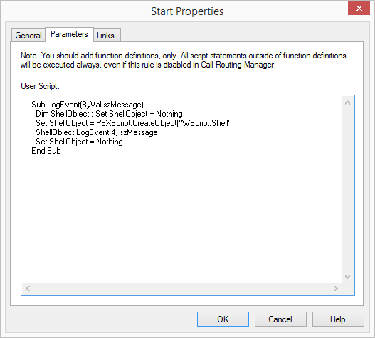 The script is entered in the "User Script" field located on the "Parameters" tab of the Start rule block. This Visual Basic Script is started if this script is called during call handling.