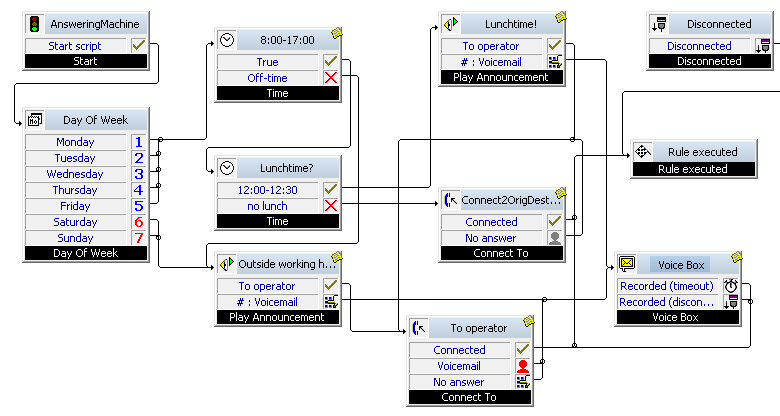 If a call comes in on the weekend or outside working hours, a voice message will be recorded. During business hours (Monday to Friday from 8:00 a.m. to 5:00 p.m.) and excluding the lunch break (12:00-12:30), an attempt will first be made to connect the call to the original destination. If the person called does not answer or if this person is called during the lunch break, the call will be redirected to the operator. If the control panel does not answer or if the '#' key is pressed by the caller during the announcements, a voice message is recorded.