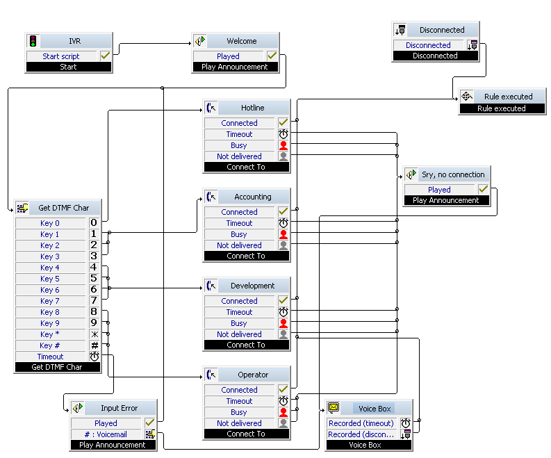 The caller hears an announcement in which he is prompted to enter a DTMF tone in order to be connected to the department of his choice (Hotline, Accounting, Development) or to be connected to the operator. If a transfer is not successful, a voice message is recorded.