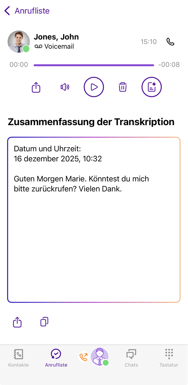 Die Voicemail wird zu Text umgewandelt und angezeigt.