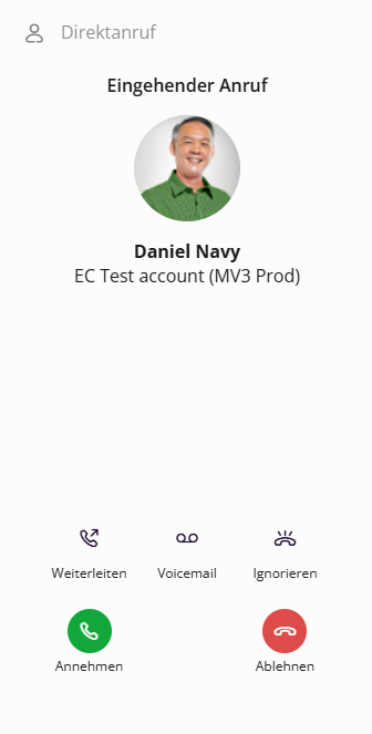 Wenn du einen eingehenden Anruf auf dem von dir ausgewählten Gerät erhältst, siehe Gerät für eingehende Anrufe, hast du mehrere Möglichkeiten. Sie können den Anruf annehmen, ihn an ein anderes Ziel weiterleiten, z. B. an einen Kollegen oder Ihre Voicemail, oder ihn abweisen.