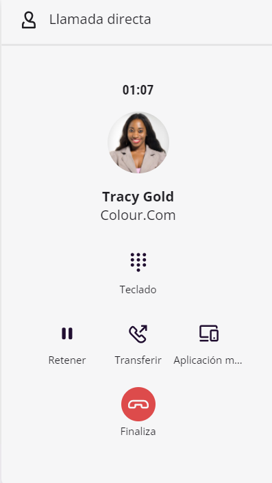 Una vez establecida la llamada, puedes abrir el teclado para introducir dígitos DTMF, transferir la llamada activa a otro destino, poner la llamada en espera y realizar un cambio de dispositivo para transferir sin problemas una llamada activa a otro dispositivo.