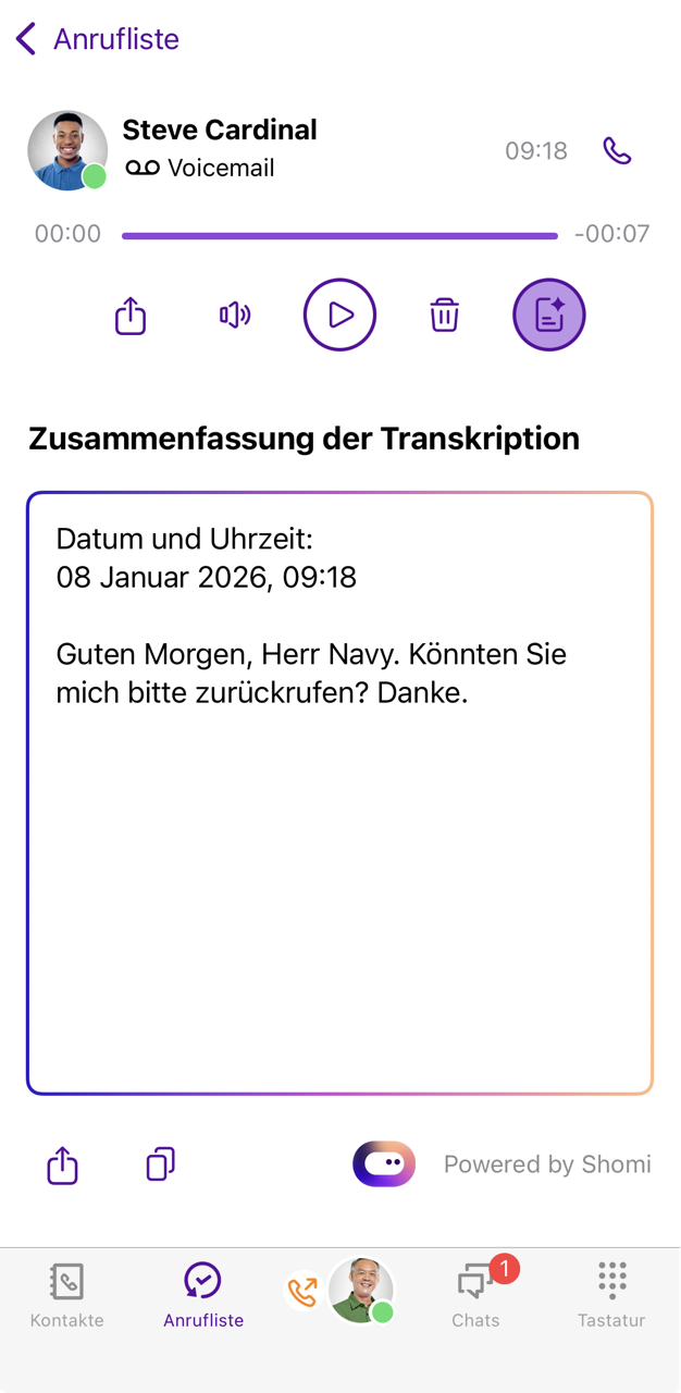 Die Sprachnachricht wird in Text umgewandelt und angezeigt.
