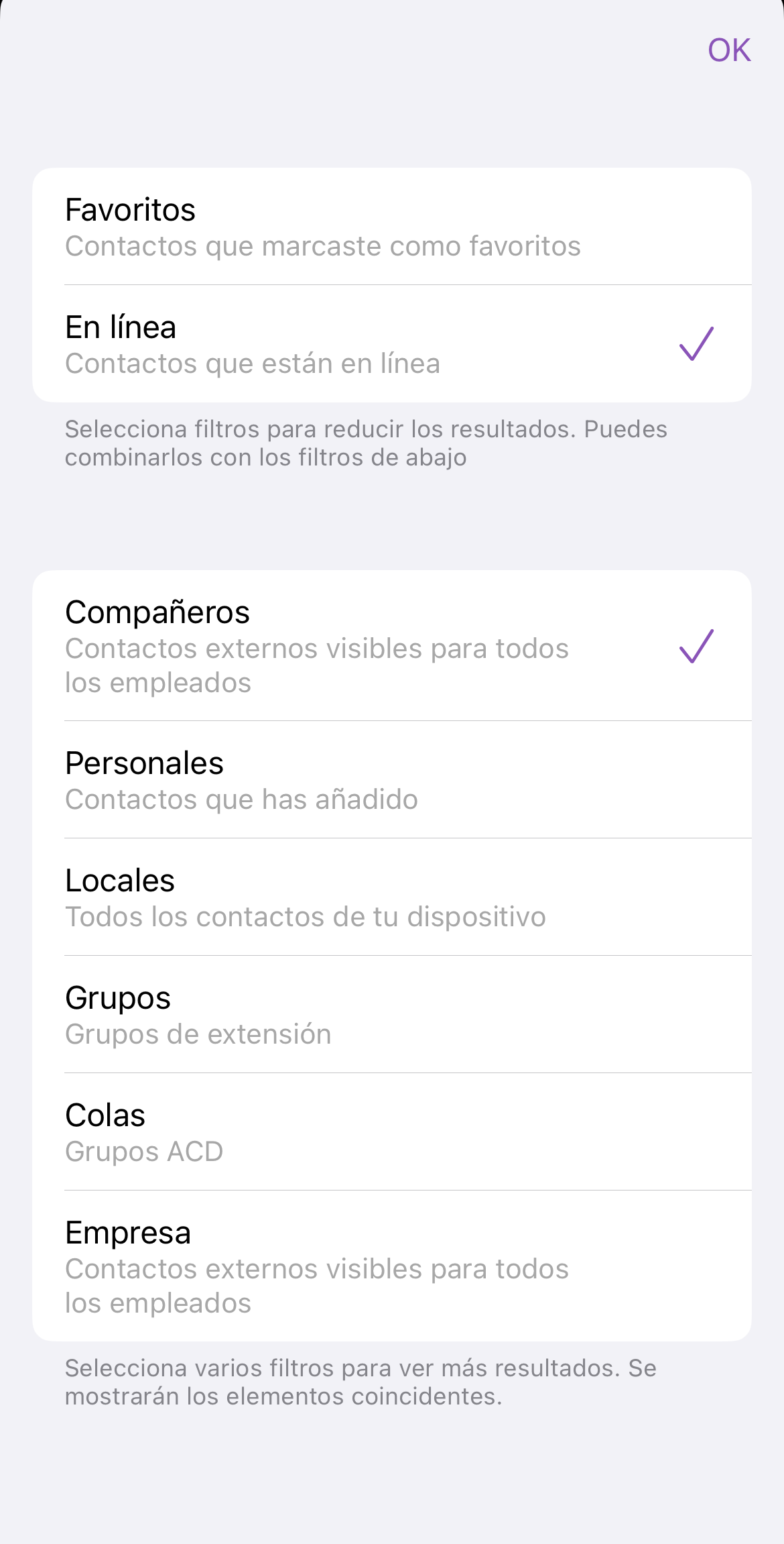 Puedes seleccionar individualmente qué fuentes de contacto deben aparecer en tu lista de contactos. Además, los contactos mostrados se pueden filtrar por favoritos y/o disponibilidad. Por ejemplo, si has seleccionado la fuente de contacto Compañeros y el filtro En línea, puedes ver rápidamente quiénes de tus Compañeros están disponibles.